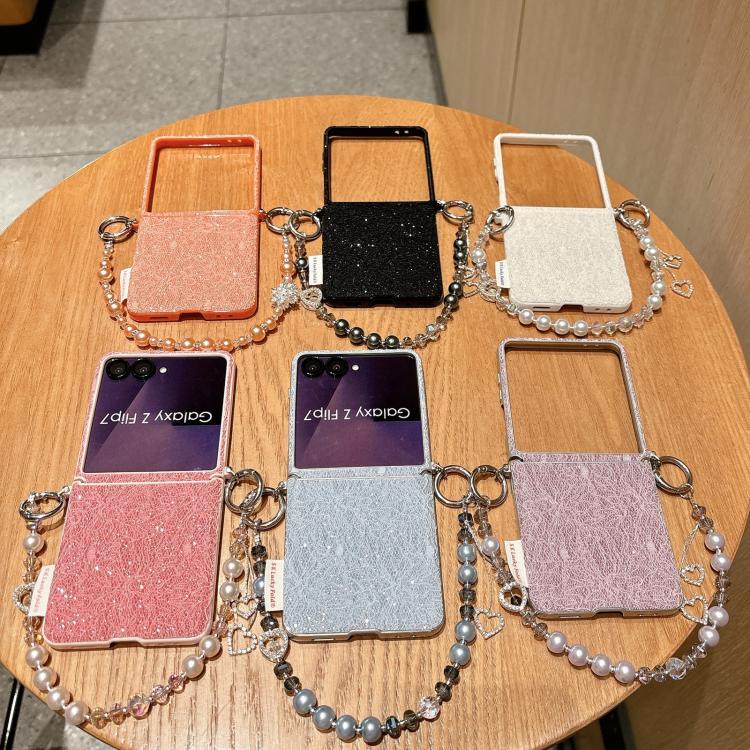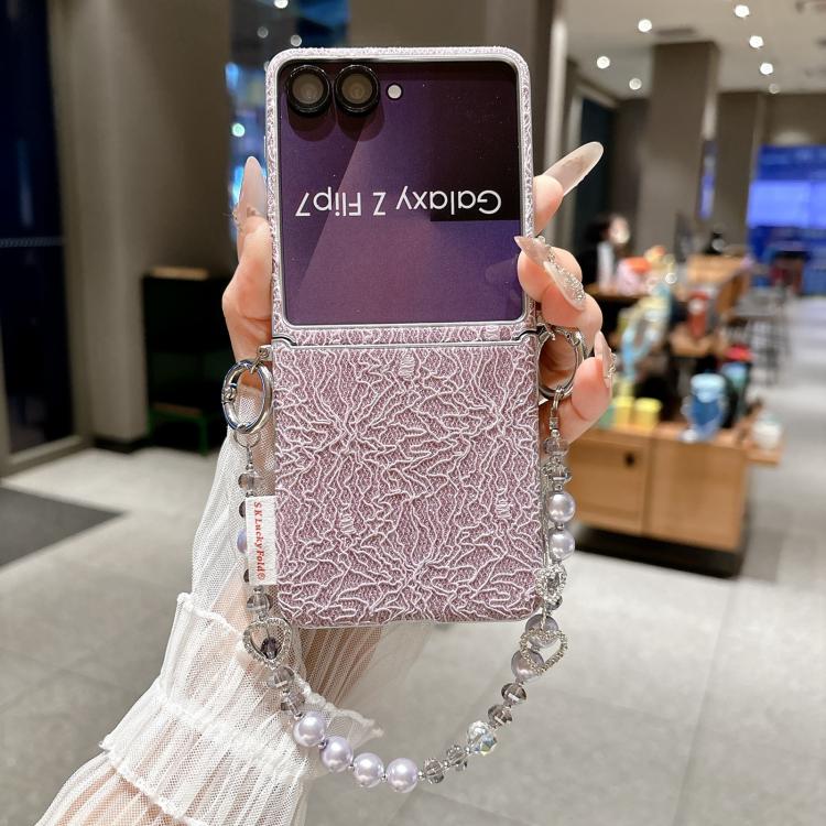 For Samsung Galaxy Z Flip7 5G Dual Side Metal Hooks Lace Embossed Phone Case with Wrist Strap(Purple)