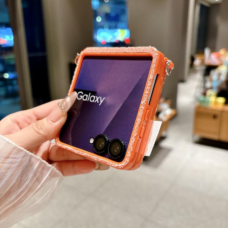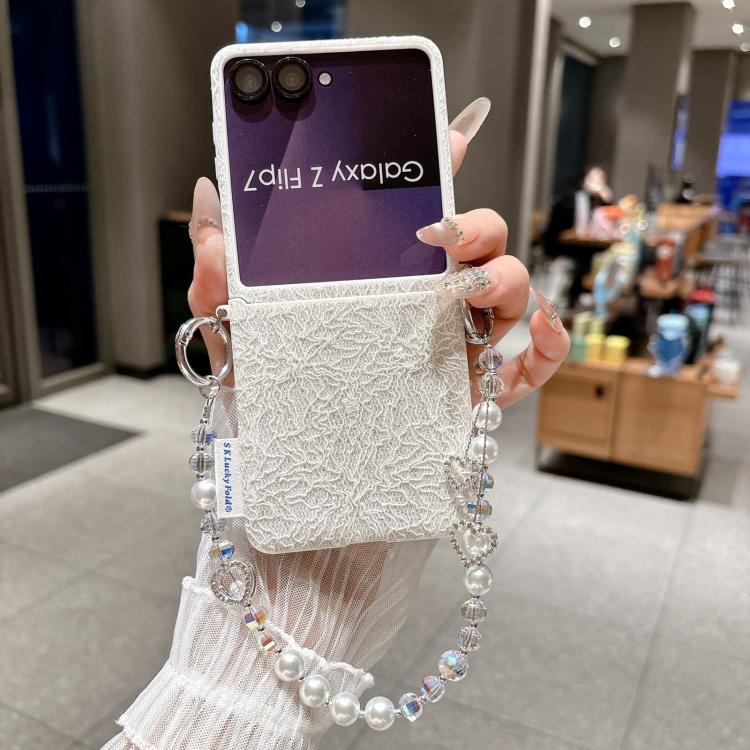 For Samsung Galaxy Z Flip7 5G Dual Side Metal Hooks Lace Embossed Phone Case with Wrist Strap(White)