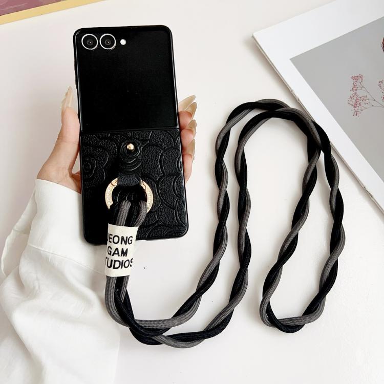For Samsung Galaxy Z Flip7 5G Impression Camellia Pattern Protective Phone Case with Diamond Ring Long Lanyard(Black)