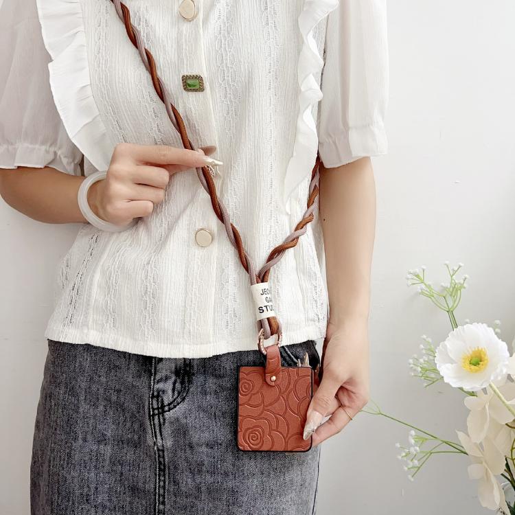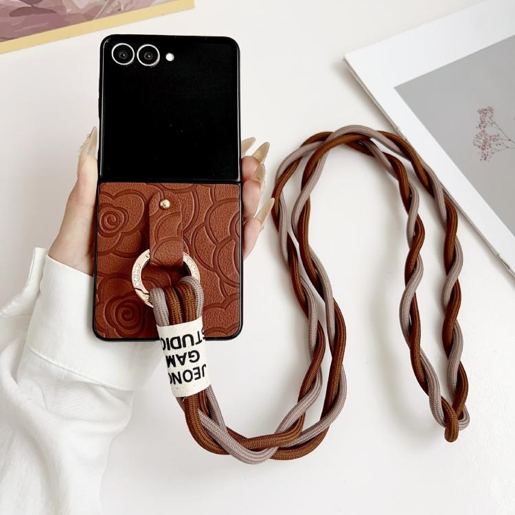 For Samsung Galaxy Z Flip7 5G Impression Camellia Pattern Protective Phone Case with Diamond Ring Long Lanyard(Brown)