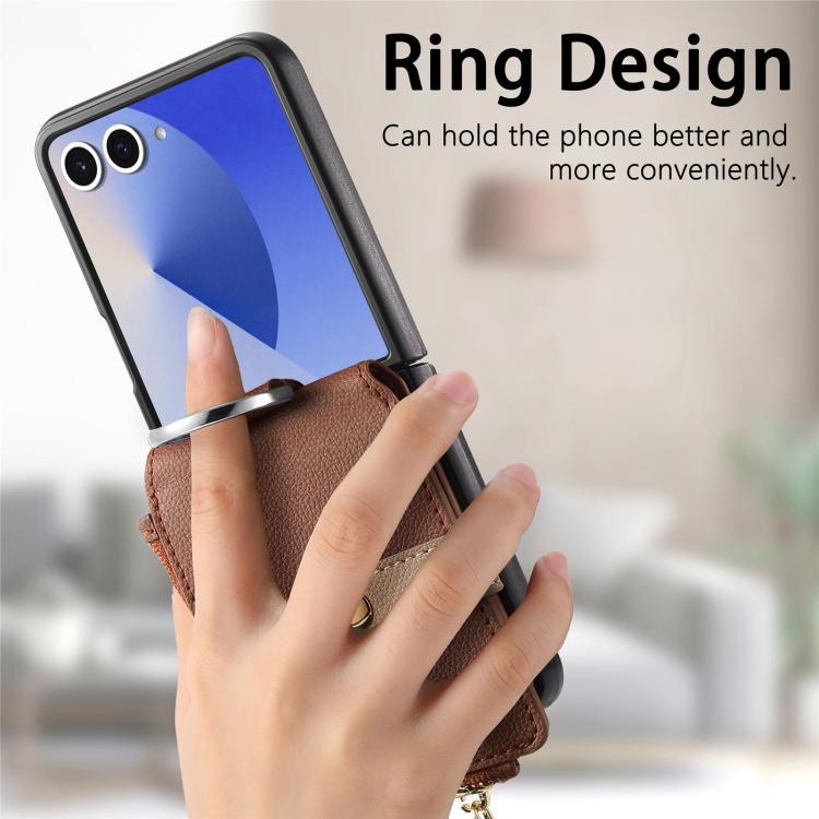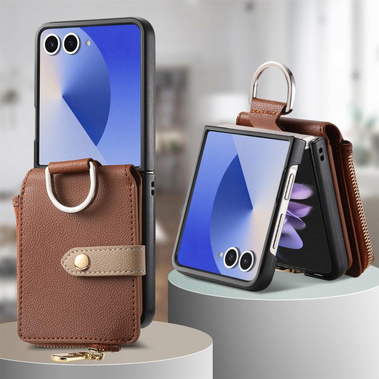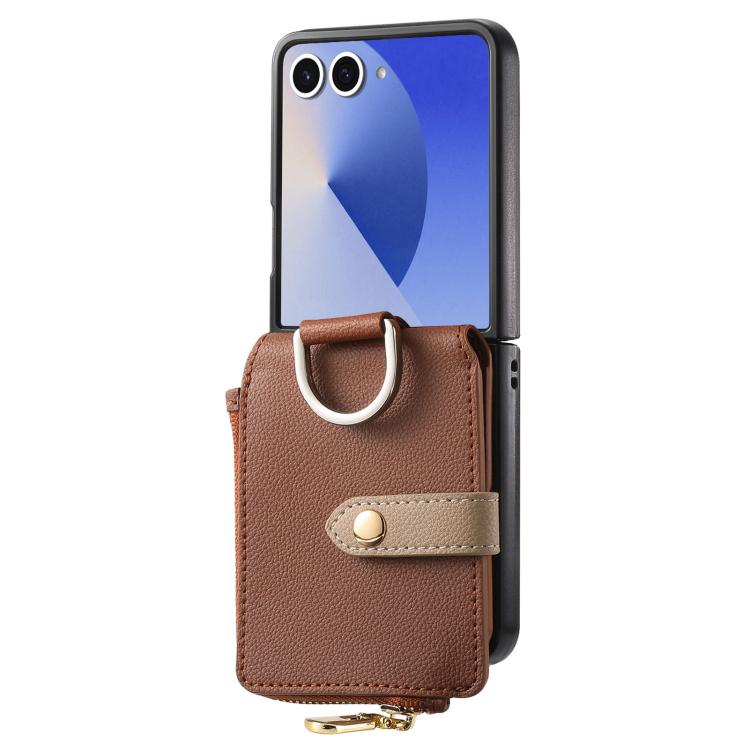 For Samsung Galaxy Z Flip7 5G Litchi Texture Ring Vertical Zipper Wallet Phone Case(Brown)