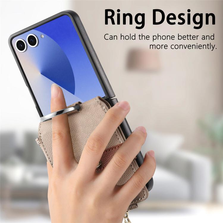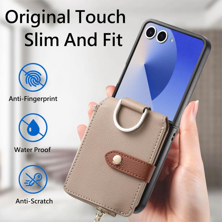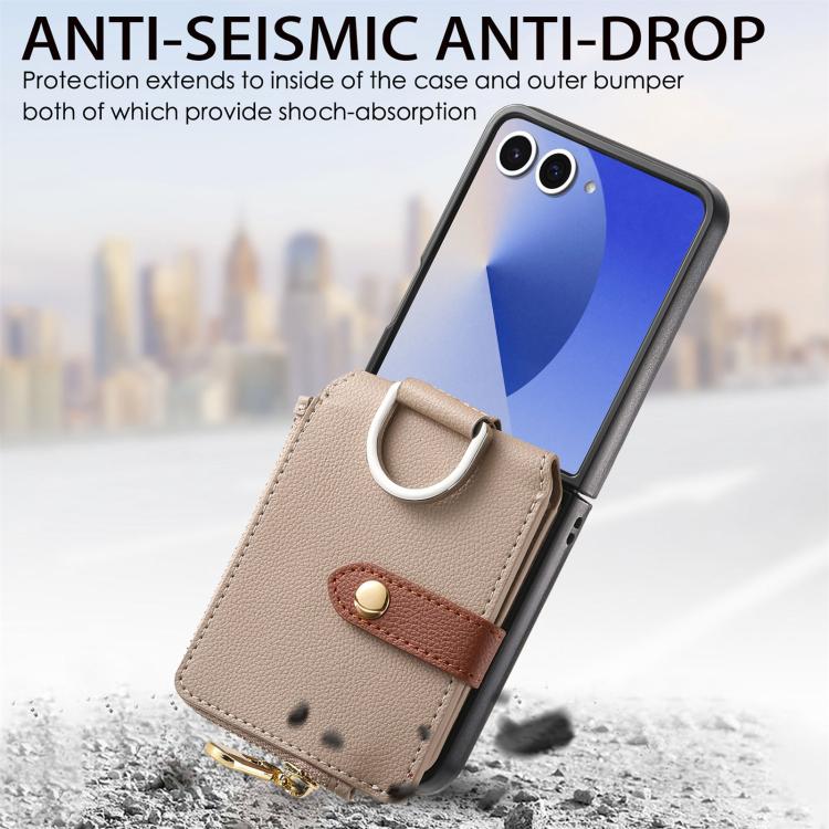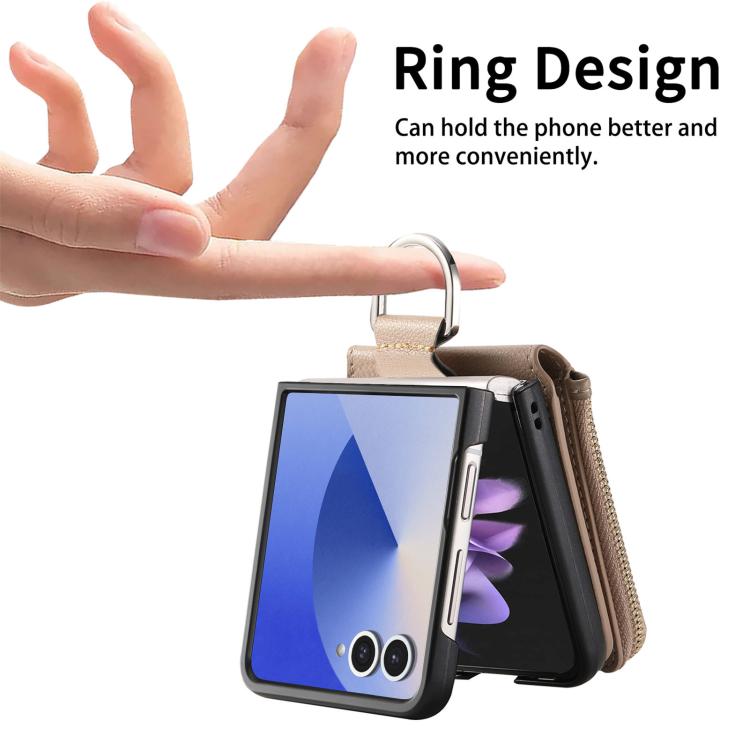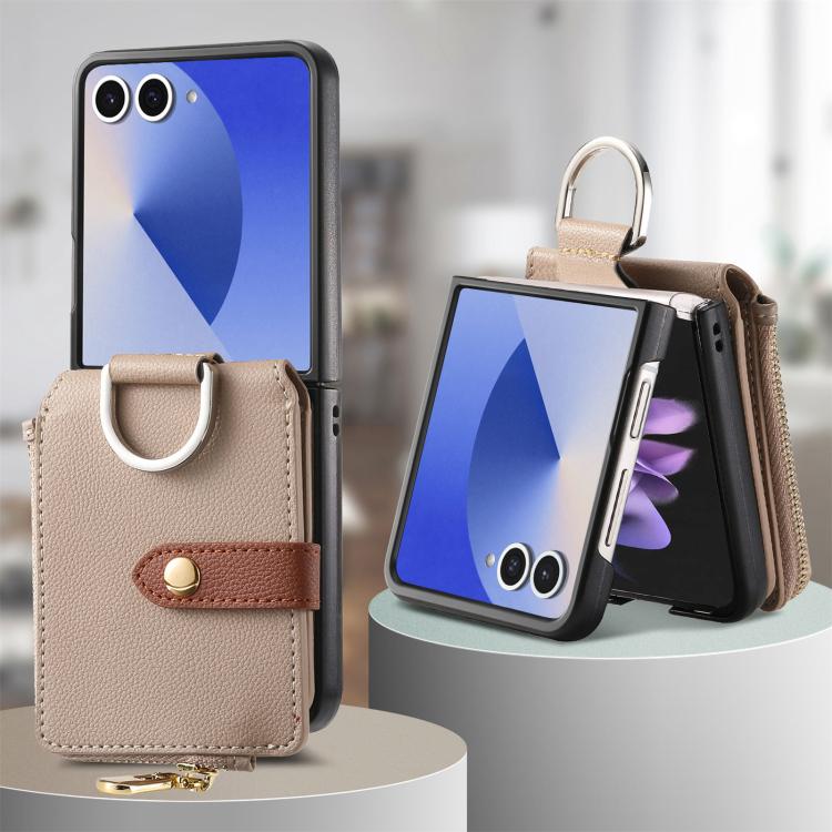 For Samsung Galaxy Z Flip7 5G Litchi Texture Ring Vertical Zipper Wallet Phone Case(Khaki)