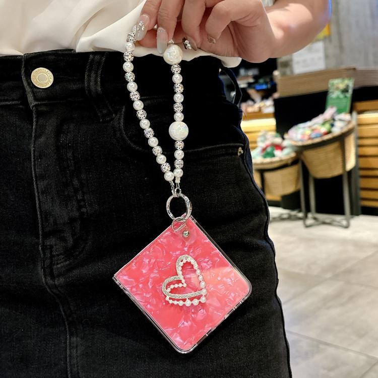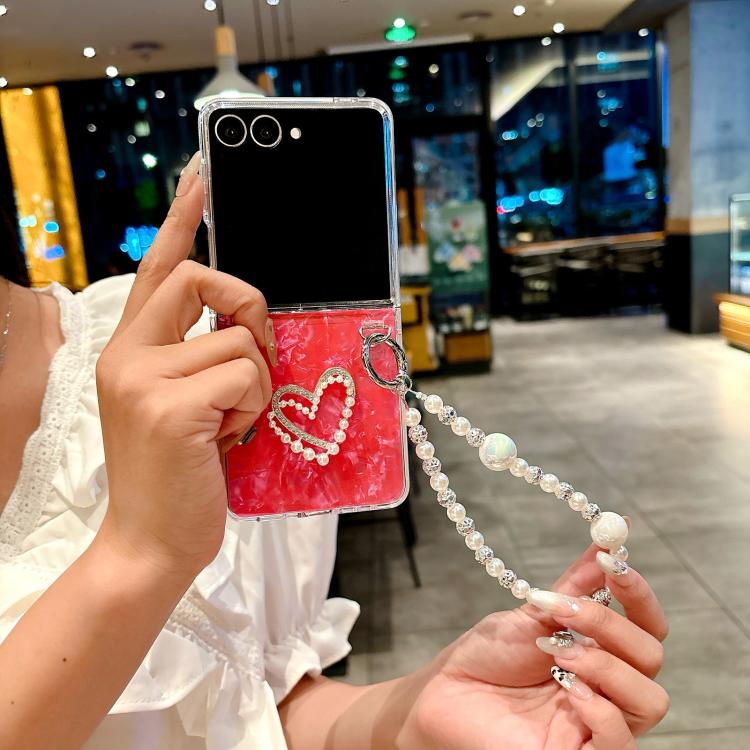 For Samsung Galaxy Z Flip7 5G Pearlescent Shell Texture Heart Pattern Phone Case with Bracelet(Red)