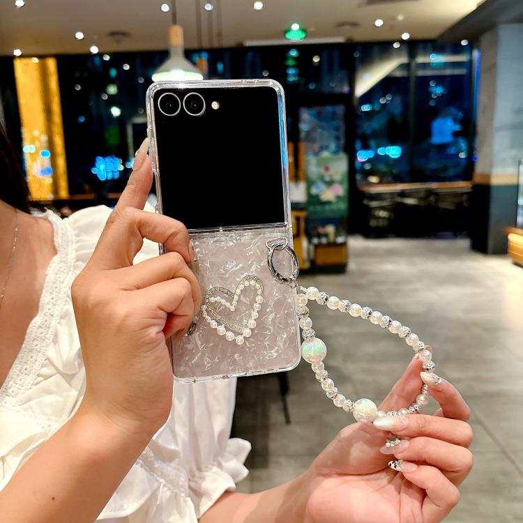 For Samsung Galaxy Z Flip7 5G Pearlescent Shell Texture Heart Pattern Phone Case with Bracelet(White)