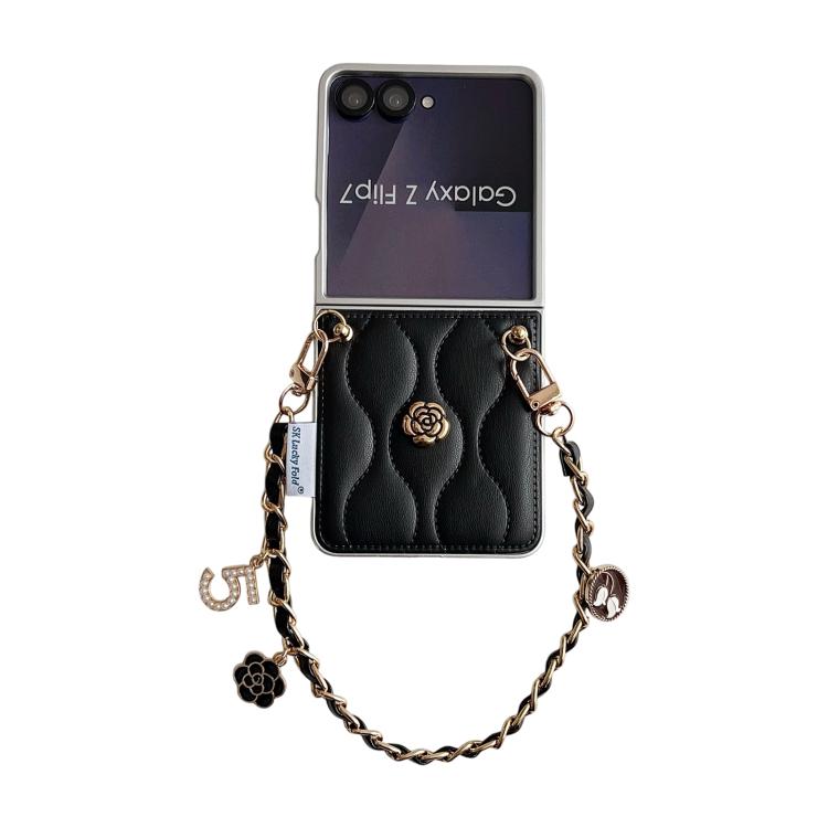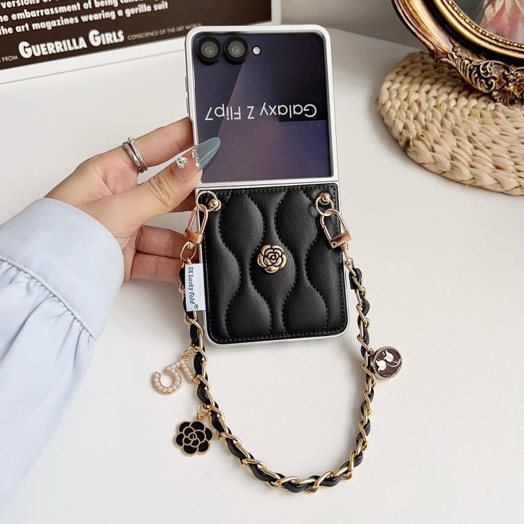 For Samsung Galaxy Z Flip7 5G Puffer Jacket 3D Camellia Pattern Phone Case with Wrist Strap(Black)
