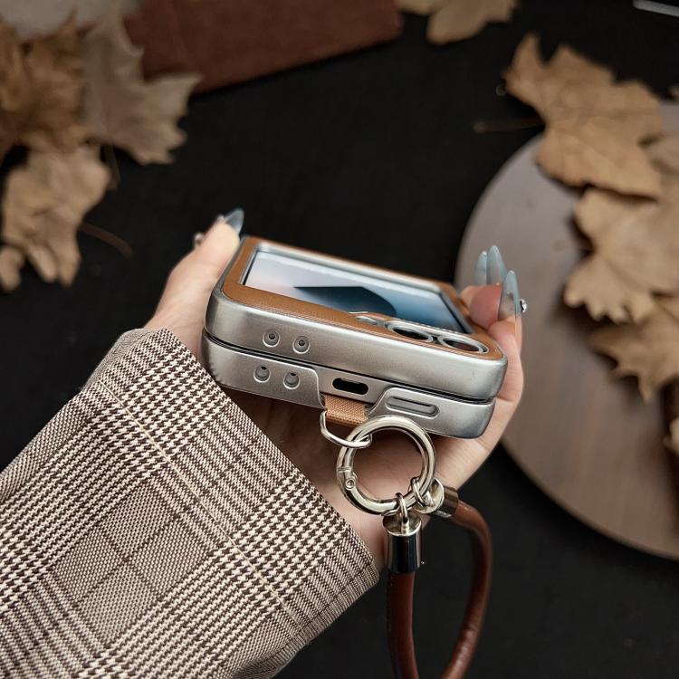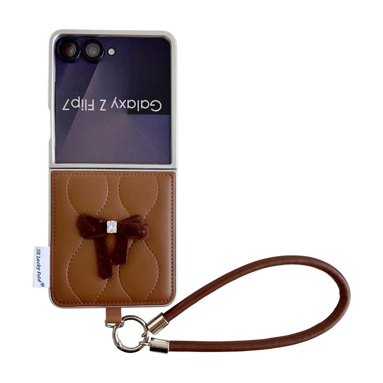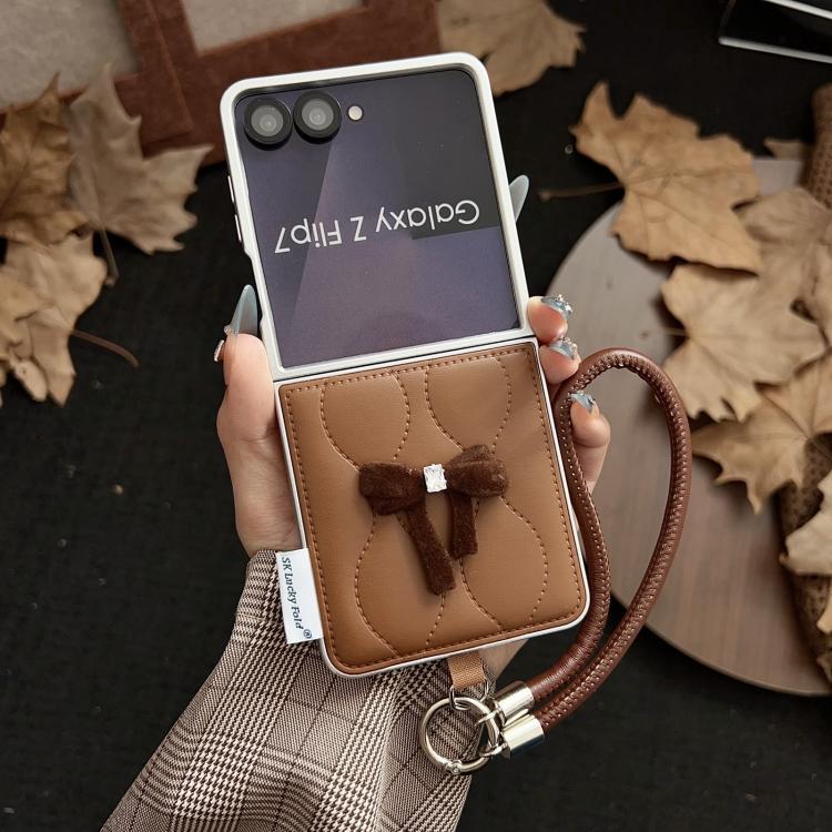 For Samsung Galaxy Z Flip7 5G Puffer Jacket Bow Phone Case with Wrist Strap(Brown)