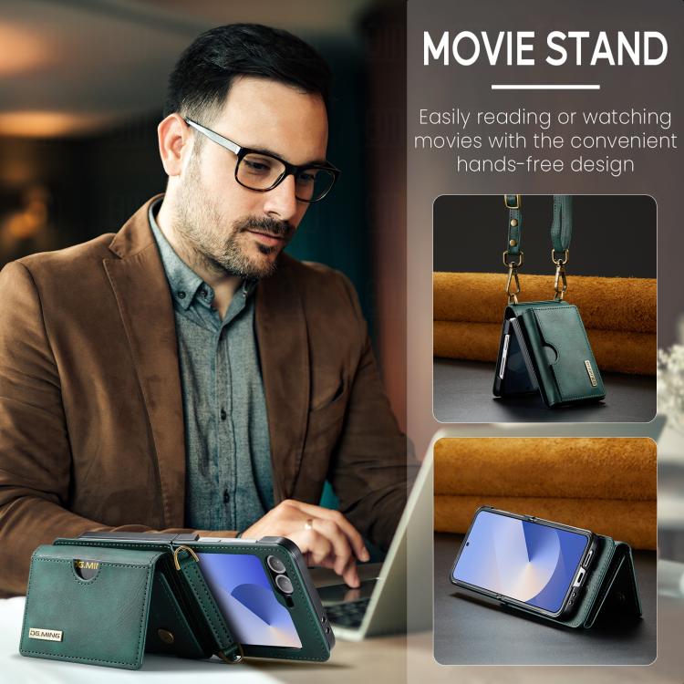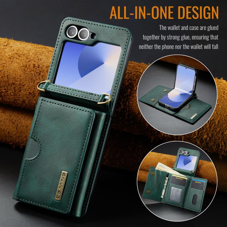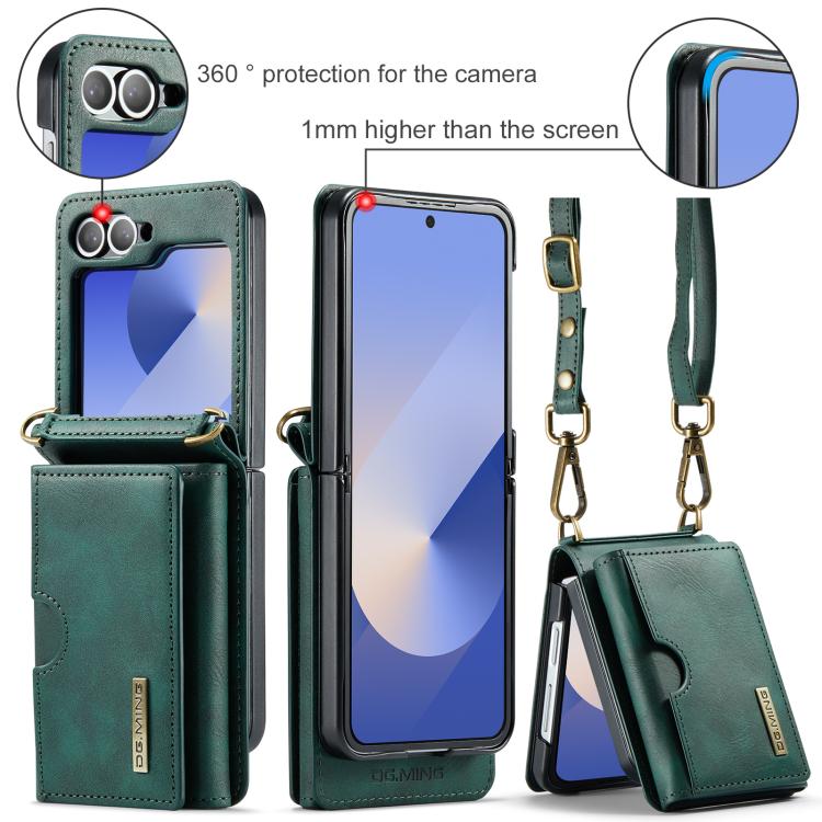 For Samsung Galaxy Z Flip7 FE / Flip6 DG.MING M6 Series RFID Tri-fold Card Bag Removable Leather Phone Case with Long Lanyard(Green)