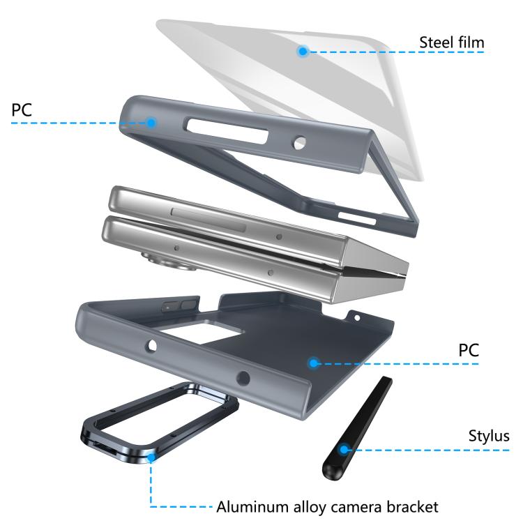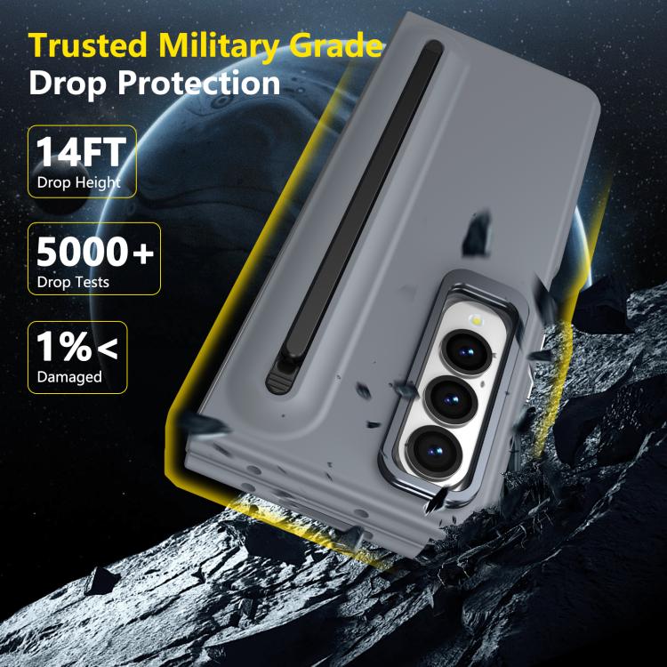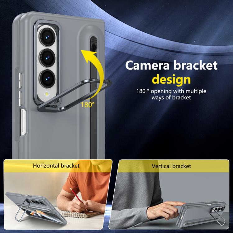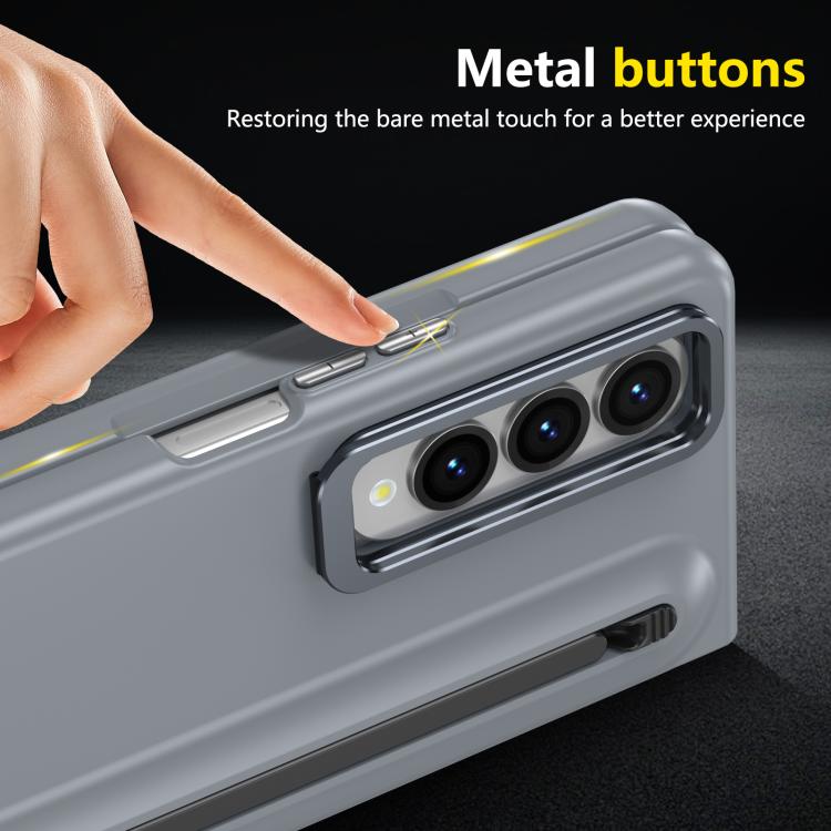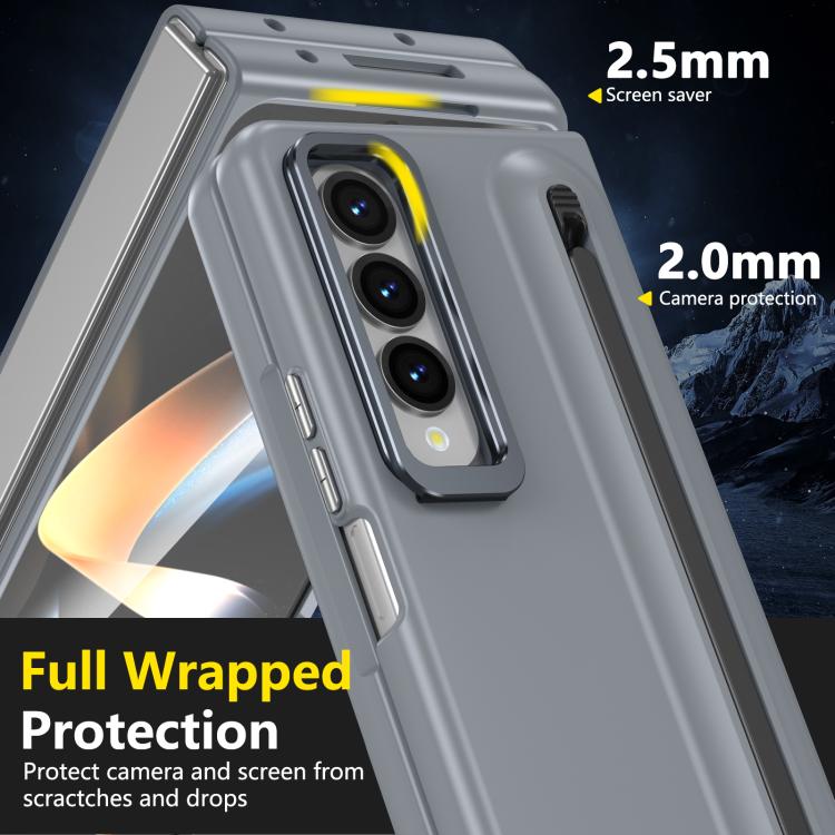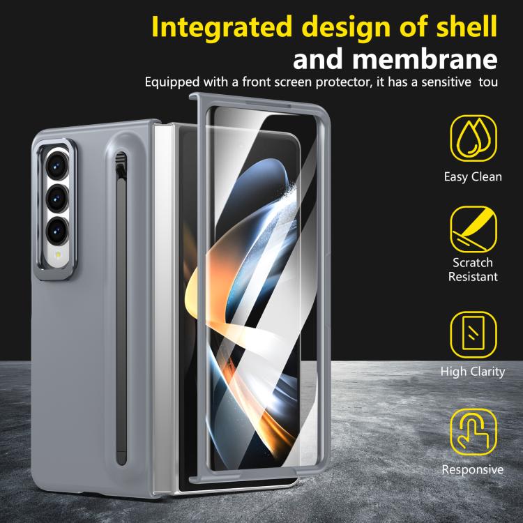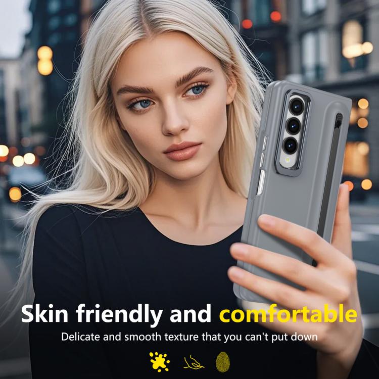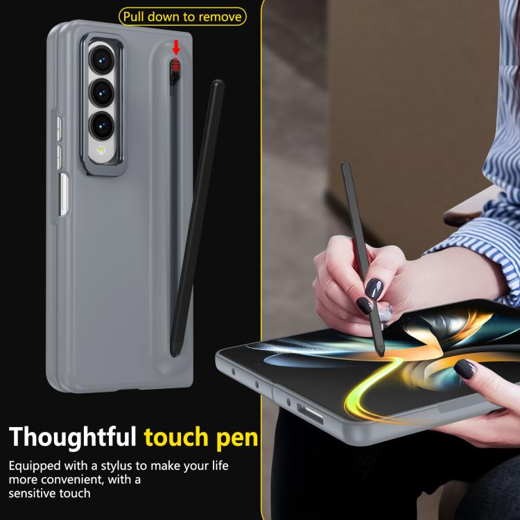 For Samsung Galaxy Z Fold4 5G Integrated Skin Feel Lens Folding Holder Pen Slot Shockproof Phone Case with Pen(Grey)