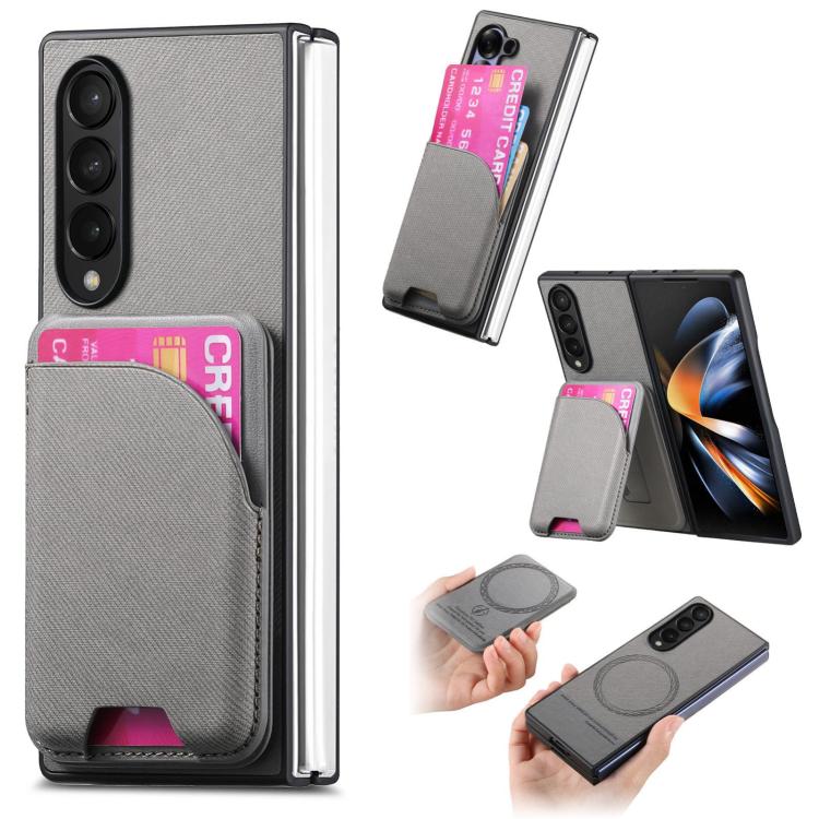 For Samsung Galaxy Z Fold4 Twill Fabric Leather Skin Card Bag Magnetic Back Phone Case(Gray)