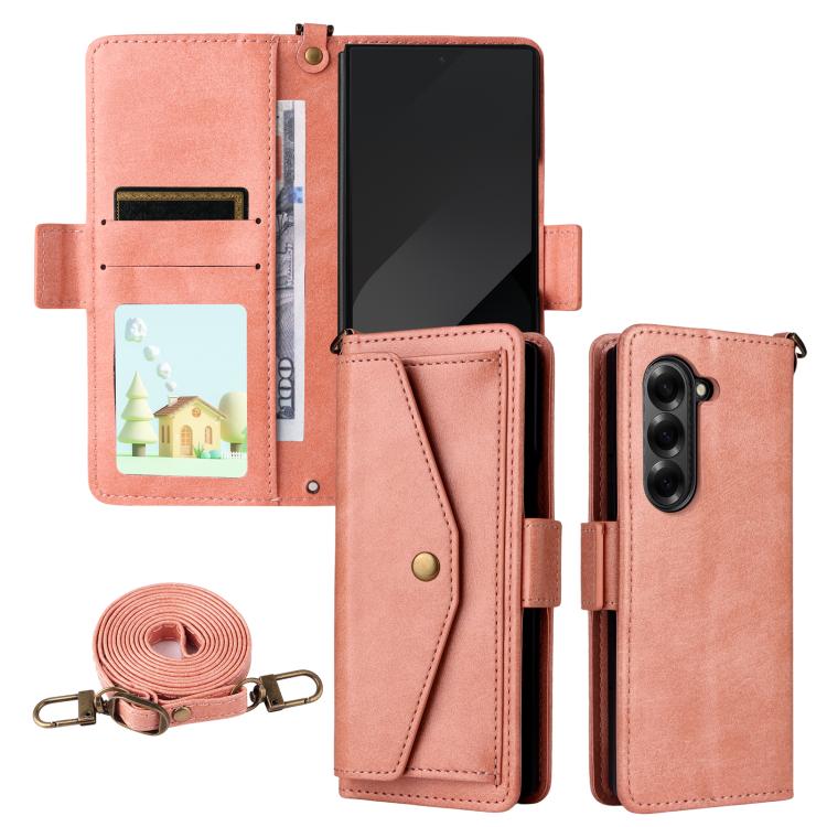 For Samsung Galaxy Z Fold5 5G Multi-card Slots Crossbody Cowhide Leather Phone Case(Pink)