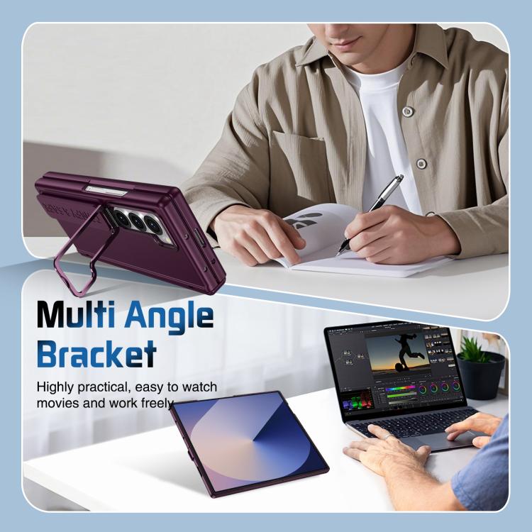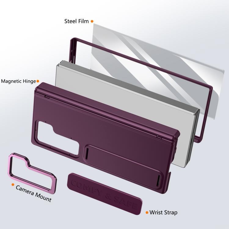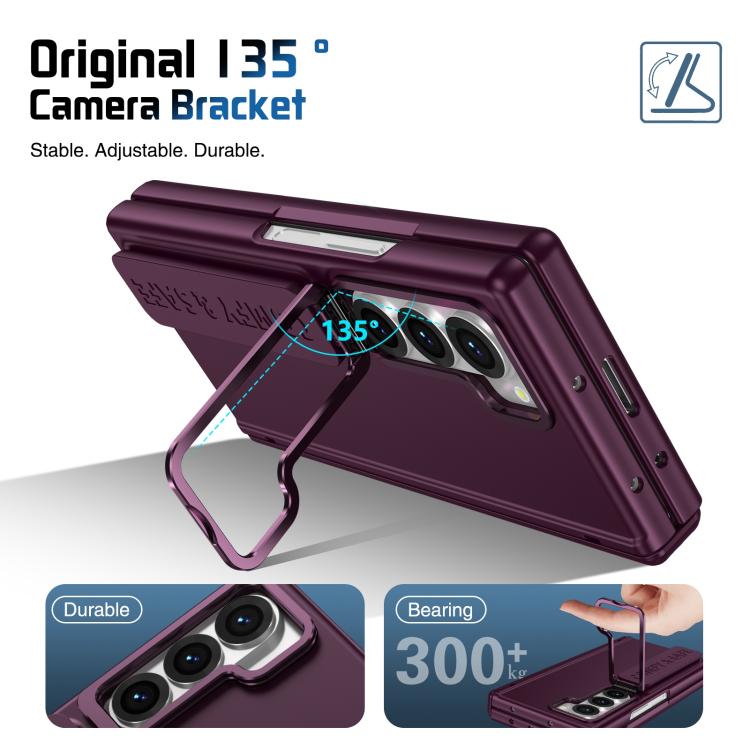 For Samsung Galaxy Z Fold6 Film Integrated Lens Frame Bracket Phone Case with Wristband(Wine Red)