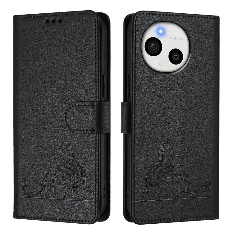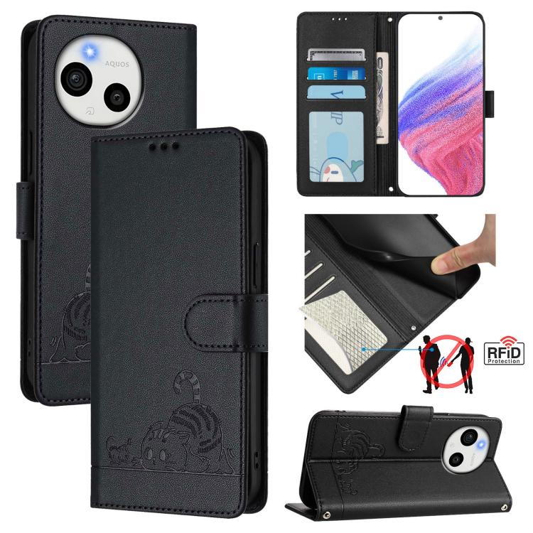 For Sharp Aquos Sense10 Cat Rat Embossed Pattern RFID Leather Phone Case with Lanyard(Black)