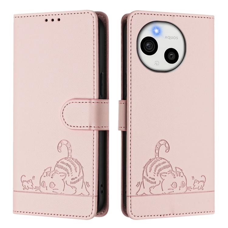 For Sharp Aquos Sense10 Cat Rat Embossed Pattern RFID Leather Phone Case with Lanyard(Pink)
