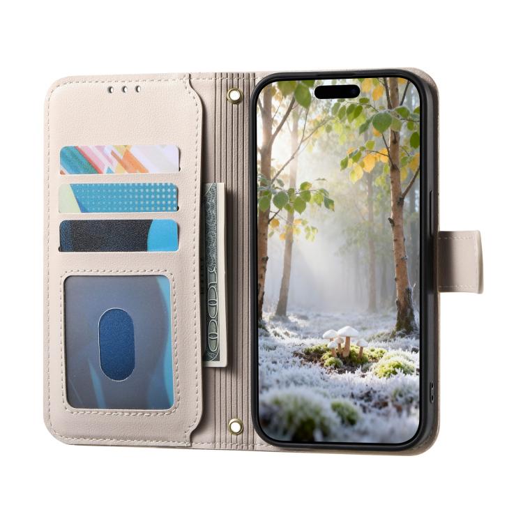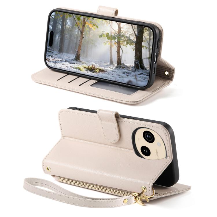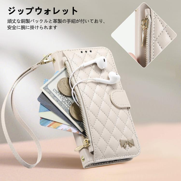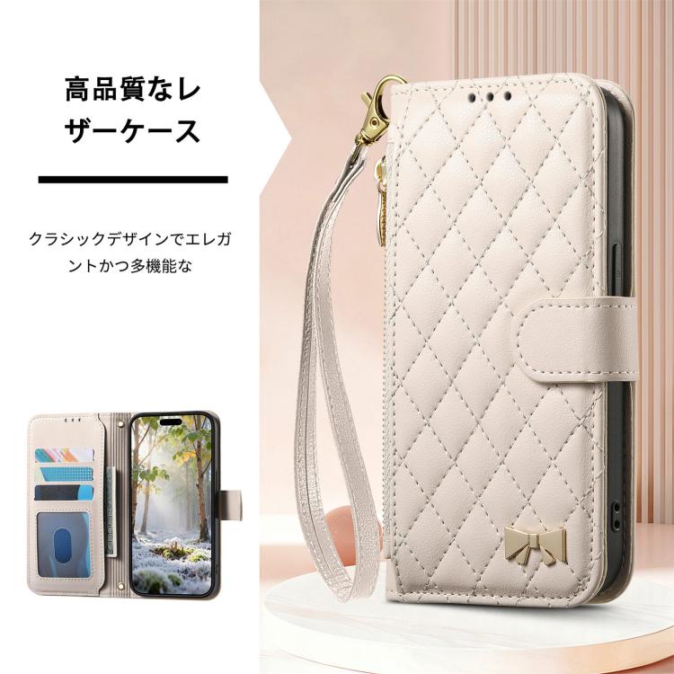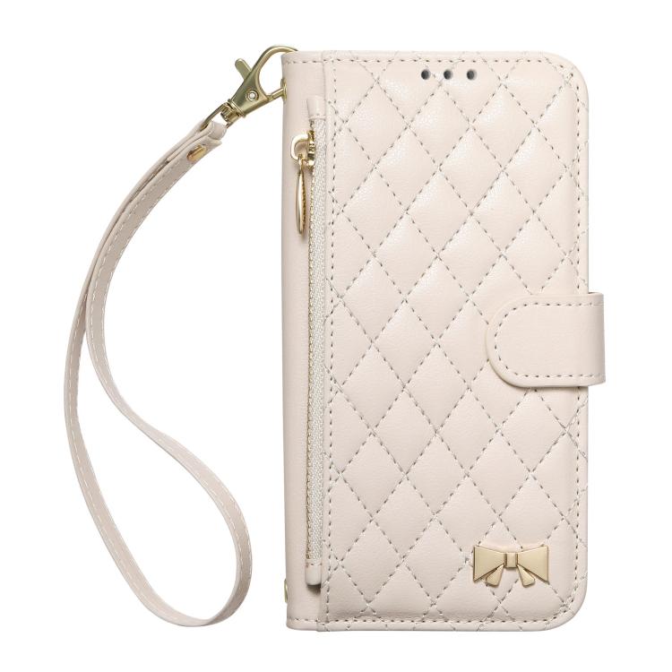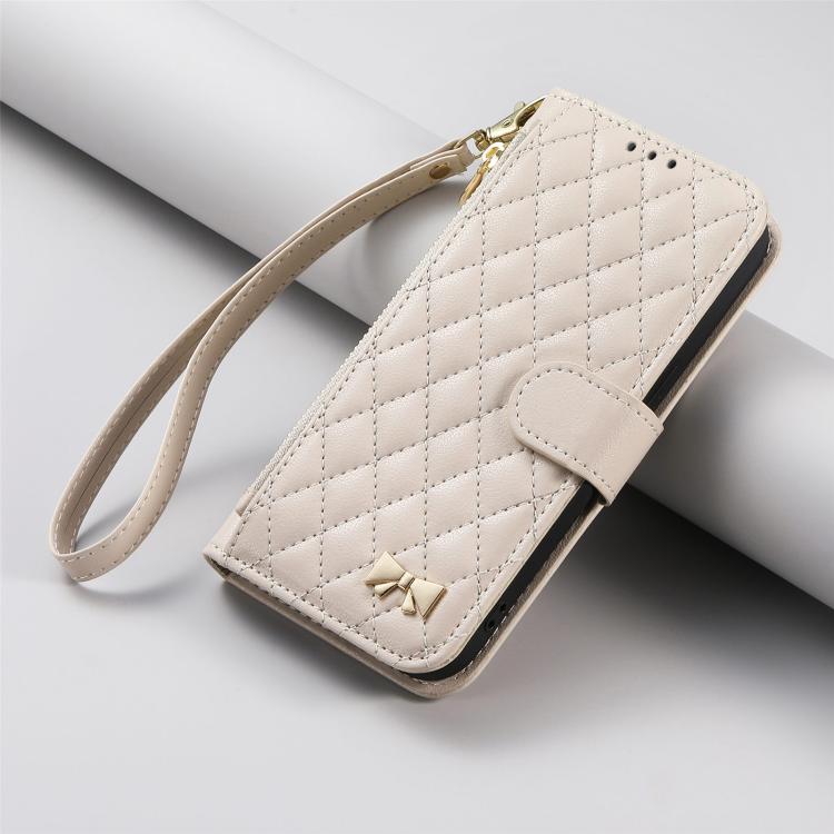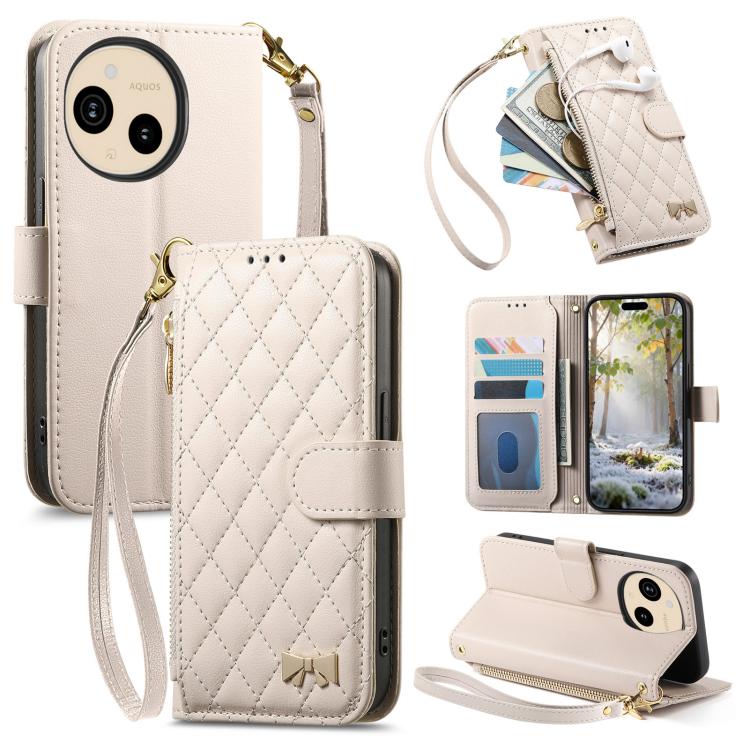 For Sharp Aquos Sense10 Rhombic Texture Zipper Wallet Metal Bow-knot Vegan Leather Phone Case with Strap(Beige)