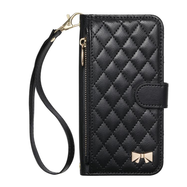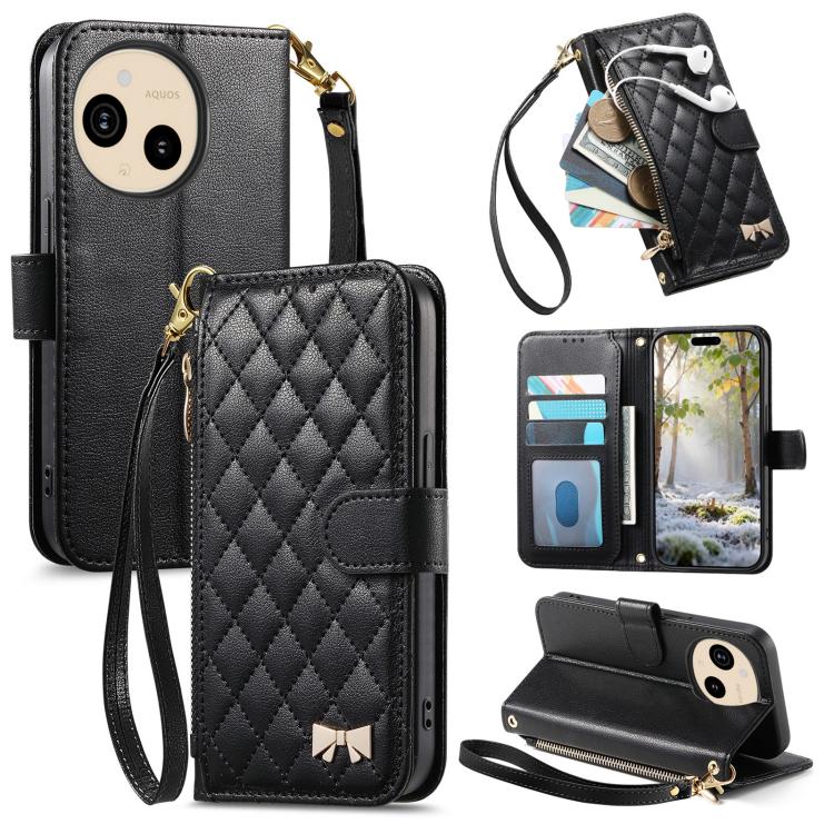For Sharp Aquos Sense10 Rhombic Texture Zipper Wallet Metal Bow-knot Vegan Leather Phone Case with Strap(Black)