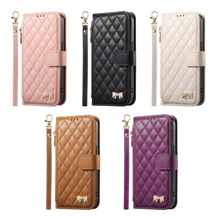 For Sharp Aquos Sense9 Rhombic Texture Zipper Wallet Metal Bow-knot Vegan Leather Phone Case with Strap(Beige)