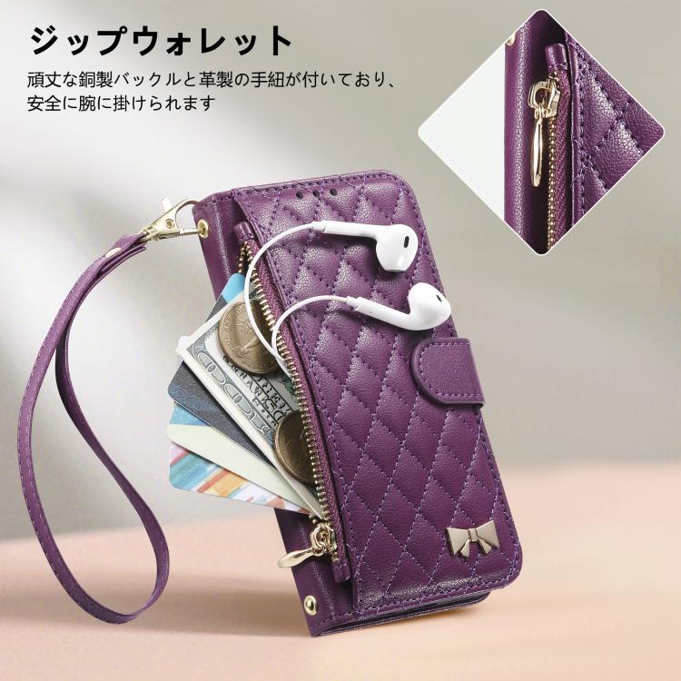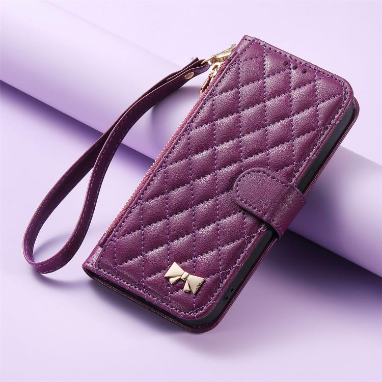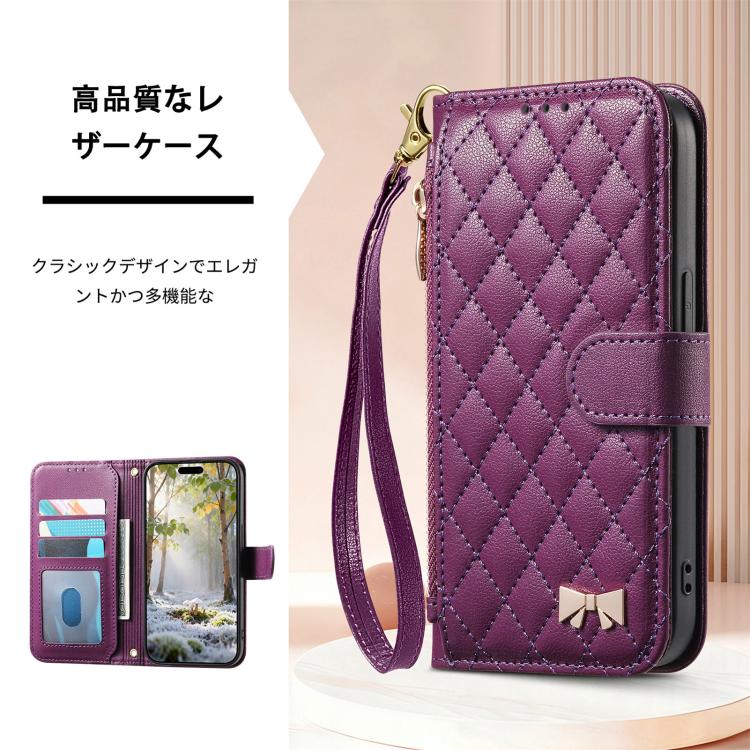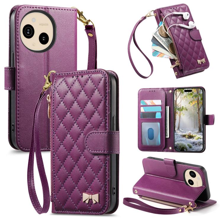 For Sharp Aquos Sense9 Rhombic Texture Zipper Wallet Metal Bow-knot Vegan Leather Phone Case with Strap(Purple)