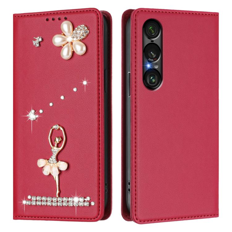 For Sony Xperia 1 VII Ballet Girl Diamond Studded RFID Vegan Leather Phone Case(Wine Red)