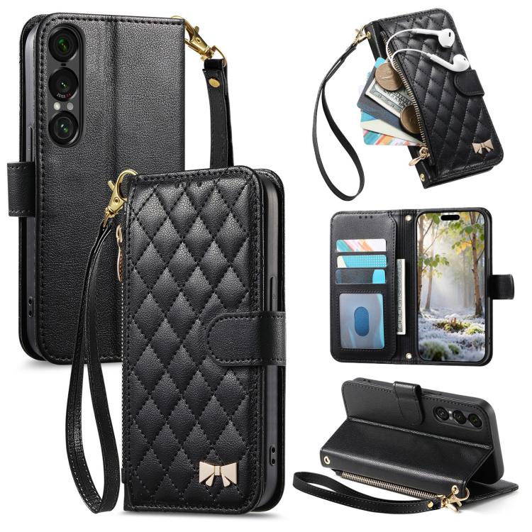 For Sony Xperia 1 VII Rhombic Texture Zipper Wallet Metal Bow-knot Vegan Leather Phone Case with Strap(Black)