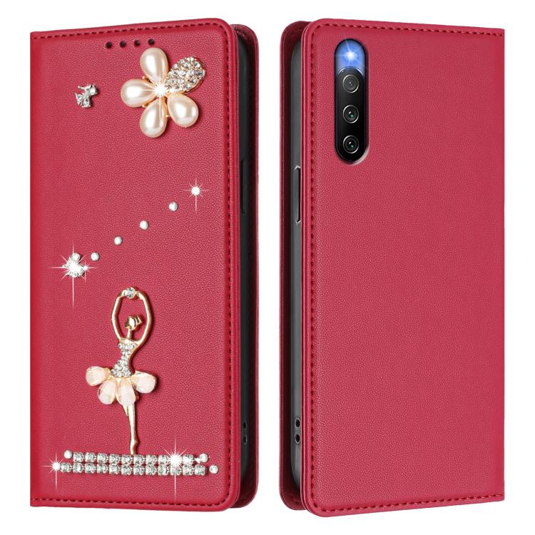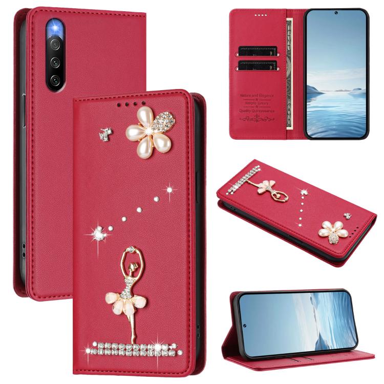 For Sony Xperia 10 IV Ballet Girl Diamond Studded RFID Vegan Leather Phone Case(Wine Red)