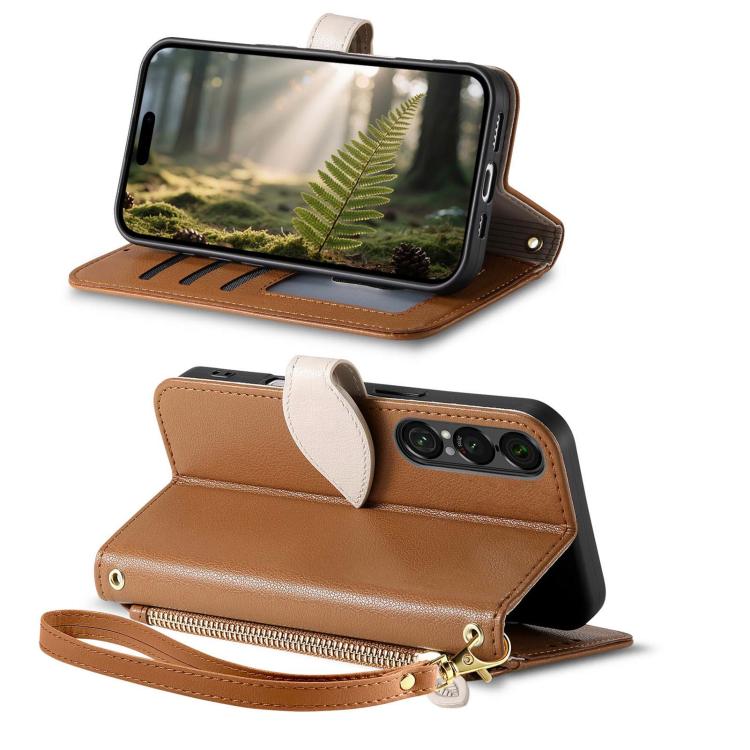 For Sony Xperia 10 VII Leaf Buckle Zipper Wallet Leather Phone Case with Strap(Brown)