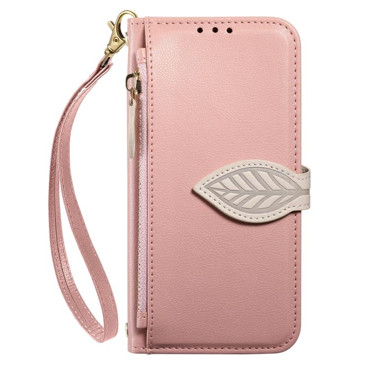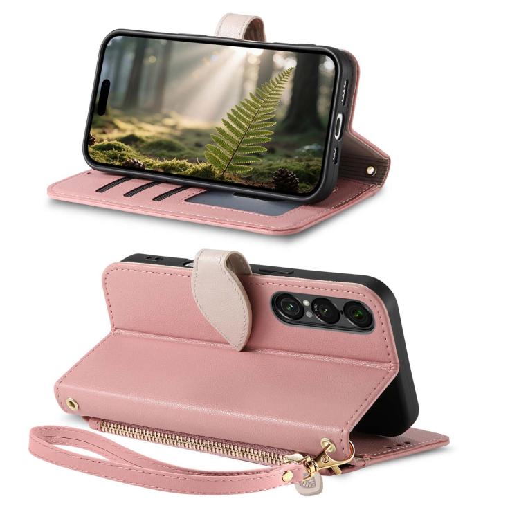 For Sony Xperia 10 VII Leaf Buckle Zipper Wallet Leather Phone Case with Strap(Pink)