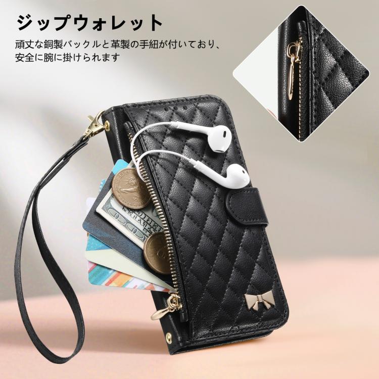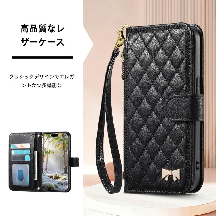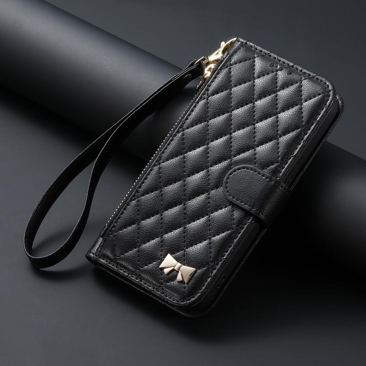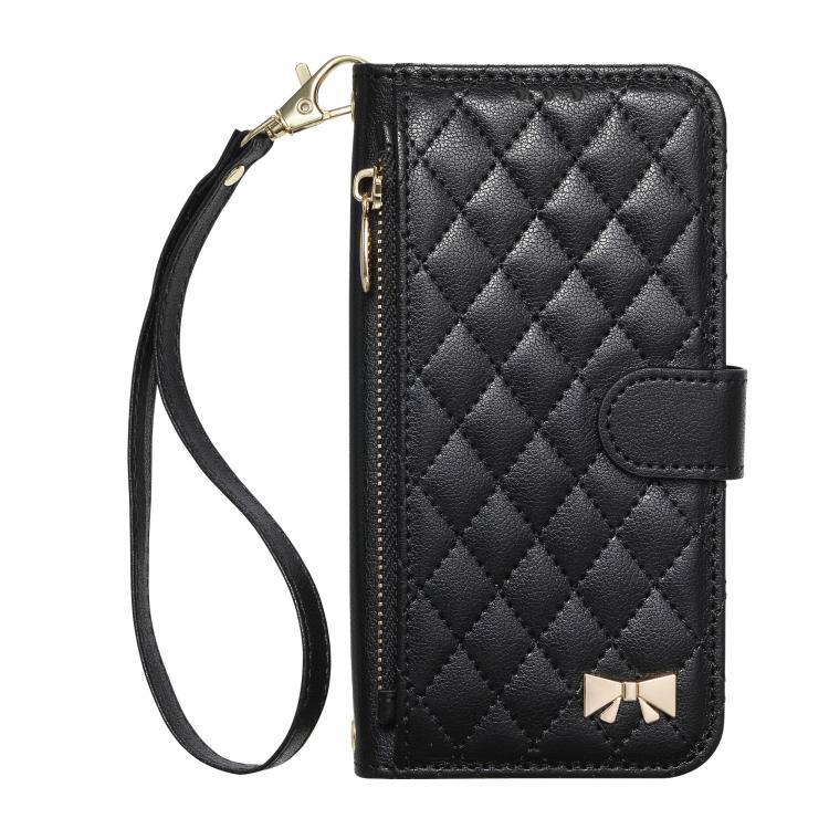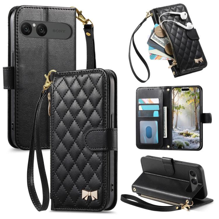 For Sony Xperia 10 VII Rhombic Texture Zipper Wallet Metal Bow-knot Vegan Leather Phone Case with Strap(Black)
