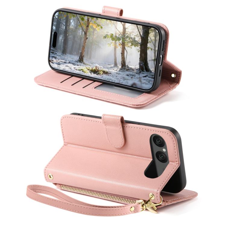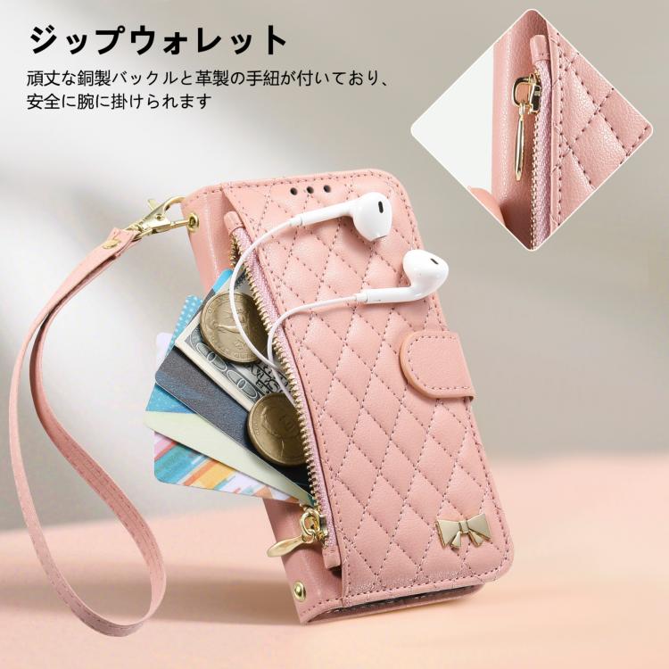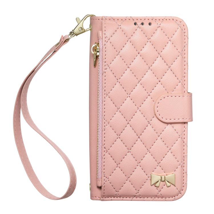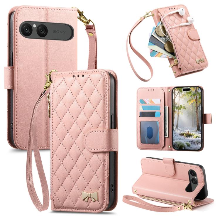 For Sony Xperia 10 VII Rhombic Texture Zipper Wallet Metal Bow-knot Vegan Leather Phone Case with Strap(Pink)