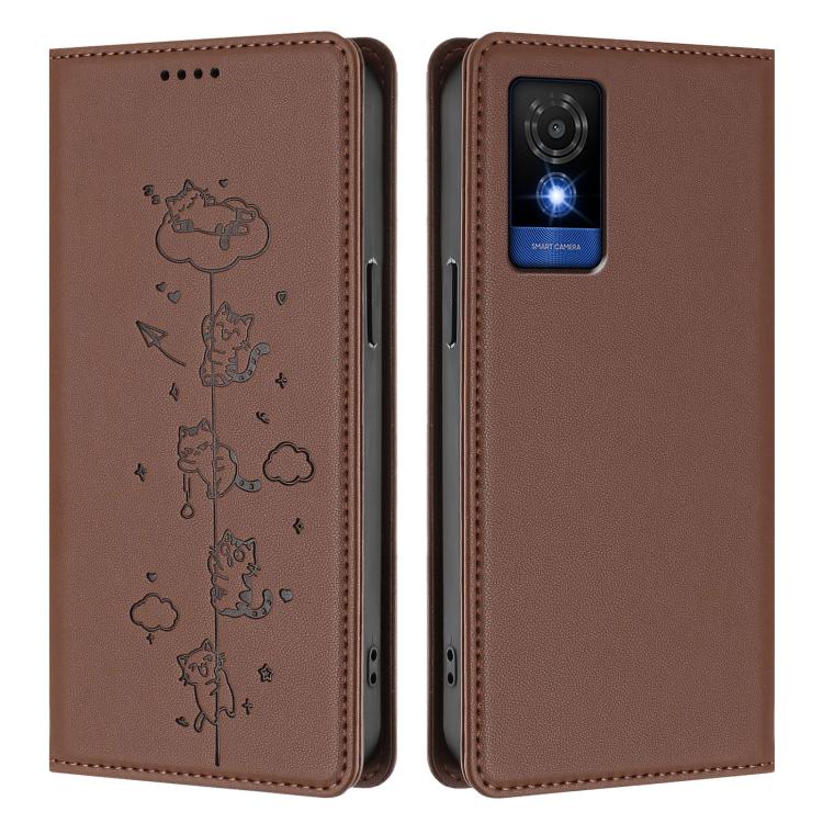 For TCL 501 Cute Cats Embossed Magnetic RFID Vegan Leather Phone Case(Brown)