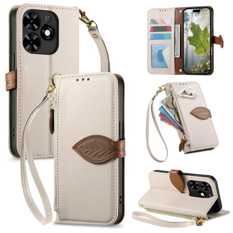 For Tecno Spark 20 Leaf Buckle Zipper Wallet Leather Phone Case with Strap(Beige)