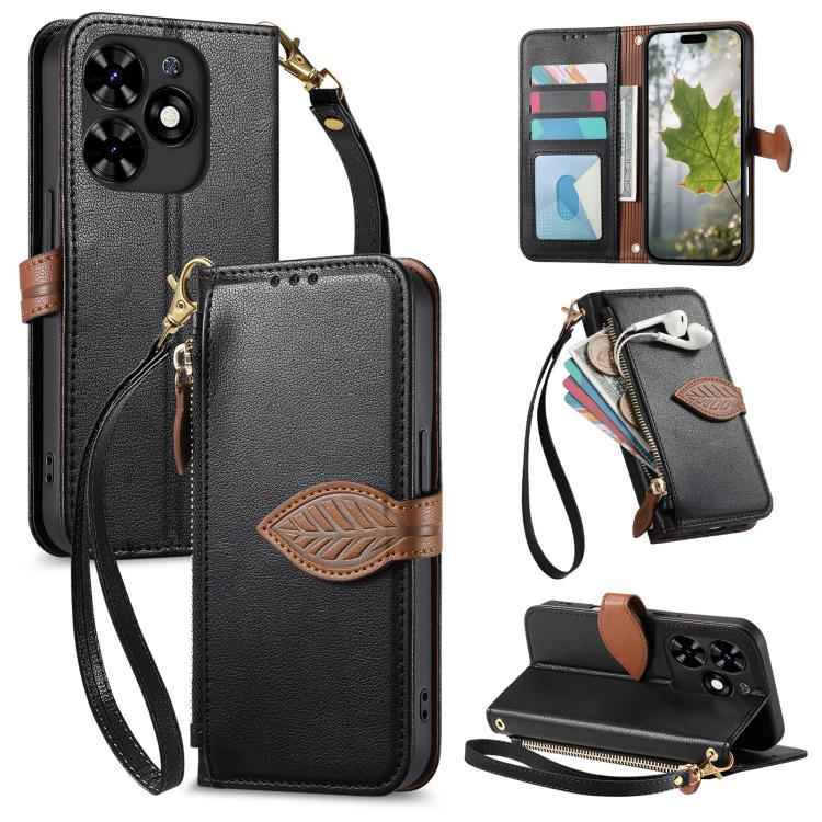 For Tecno Spark 20 Leaf Buckle Zipper Wallet Leather Phone Case with Strap(Black)