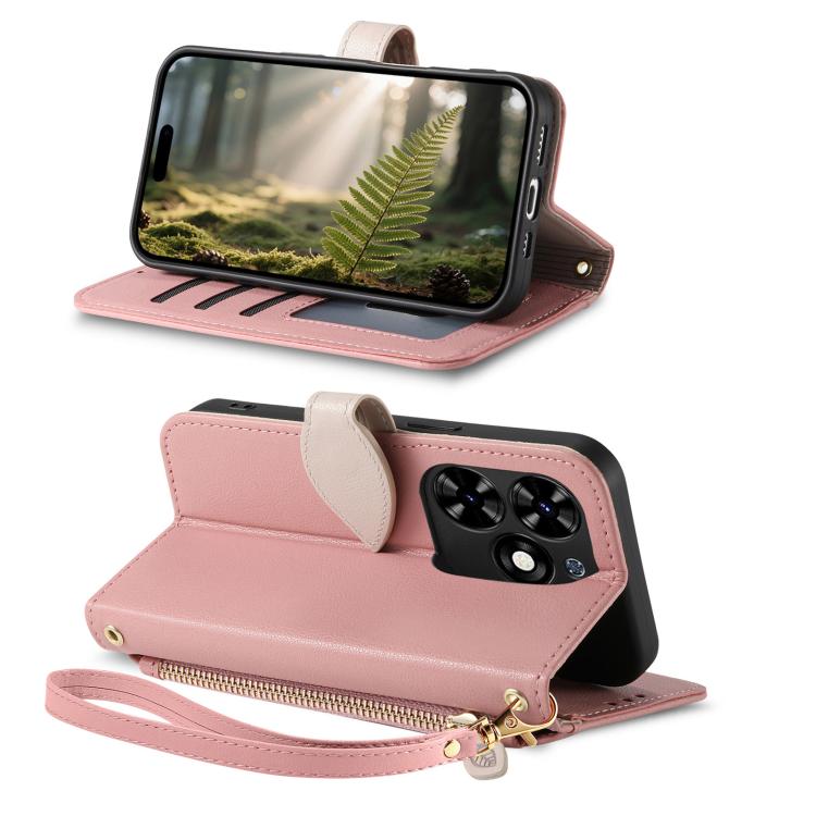 For Tecno Spark 20 Leaf Buckle Zipper Wallet Leather Phone Case with Strap(Pink)