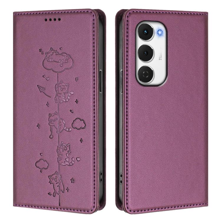For Tecno Spark 40 Pro+ 4G Cute Cats Embossed Magnetic RFID Vegan Leather Phone Case(Violet Purple)