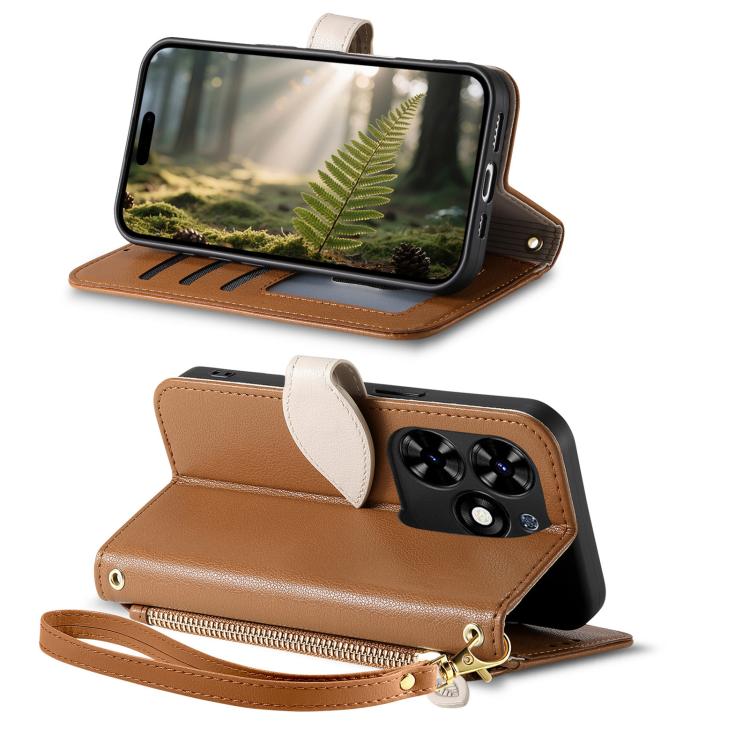 For Tecno Spark Go 2024 Leaf Buckle Zipper Wallet Leather Phone Case with Strap(Brown)