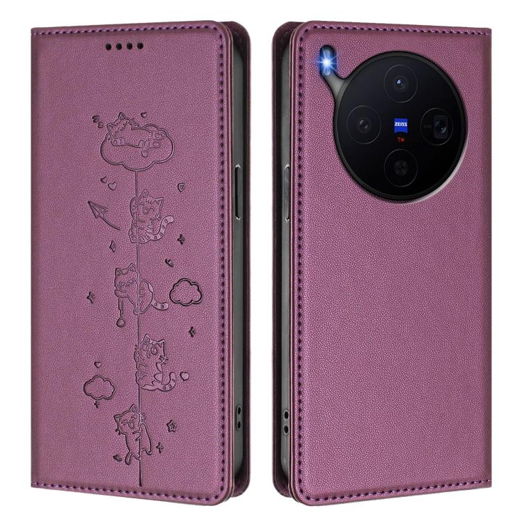 For vivo X300 Cute Cats Embossed Magnetic RFID Vegan Leather Phone Case(Violet Purple)