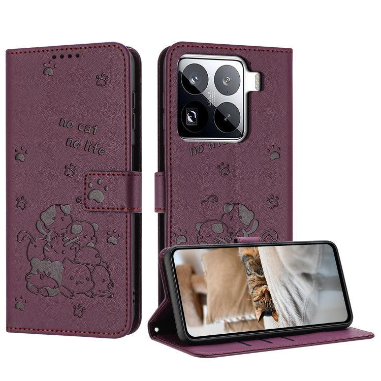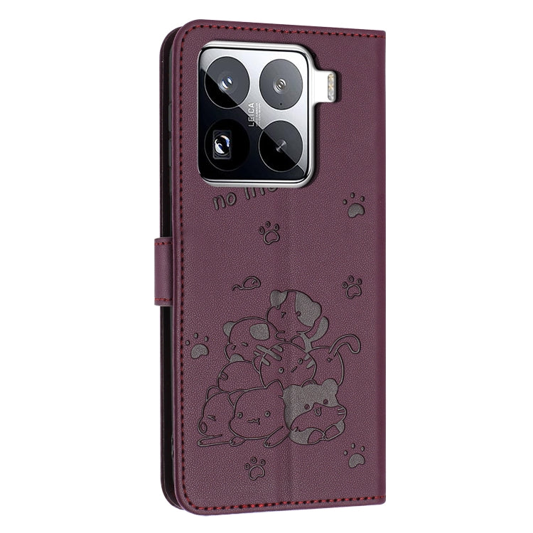 For Xiaomi 15 Pro Embossed Kitten Phone Leather Case with Lanyard(Wine Red)