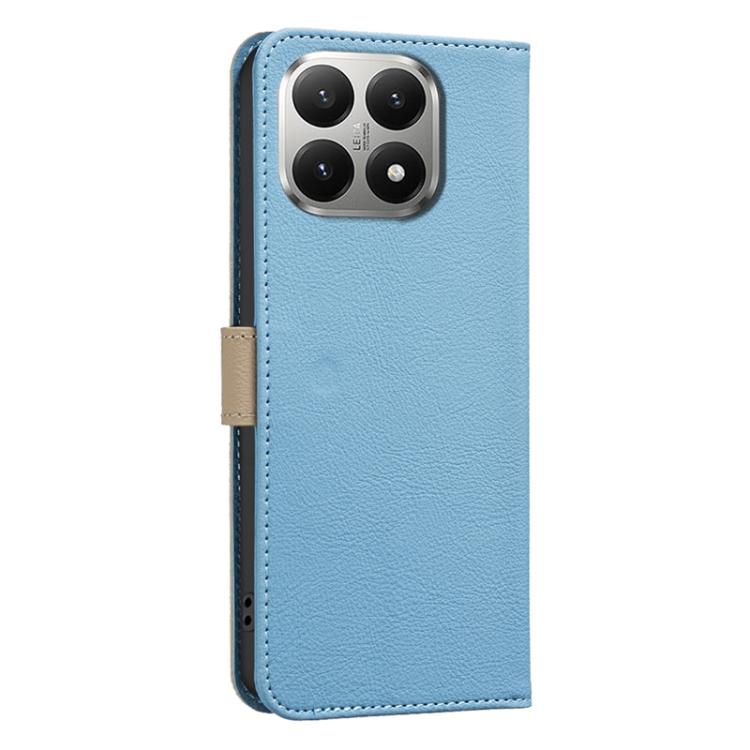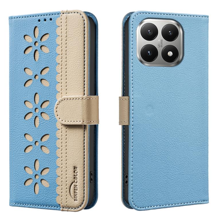 For Xiaomi 15T 5G Splicing Color Hollow Flower Pattern RFID Leather Phone Case(Baby Blue)