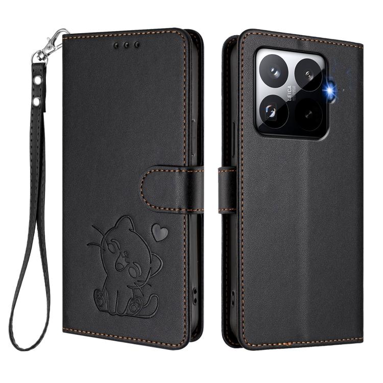 For Xiaomi 15T Pro 5G Embossed Heart Cat Leather Phone Case with Hand Strap(Black)