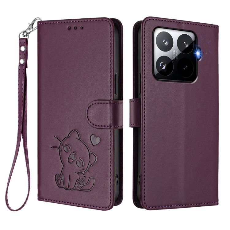 For Xiaomi 15T Pro 5G Embossed Heart Cat Leather Phone Case with Hand Strap(Dark Purple)