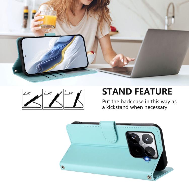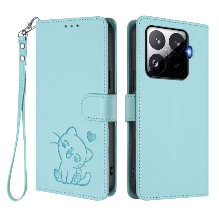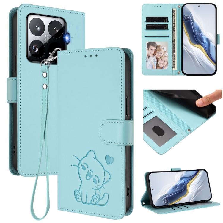 For Xiaomi 15T Pro 5G Embossed Heart Cat Leather Phone Case with Hand Strap(Mint Green)