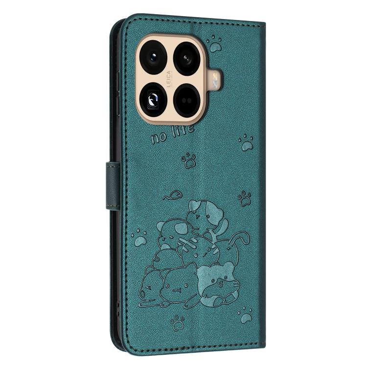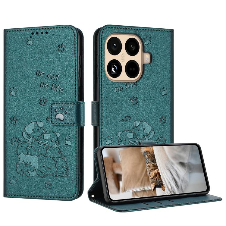For Xiaomi 15T Pro 5G Embossed Kitten Phone Leather Case with Lanyard(Dark Green)