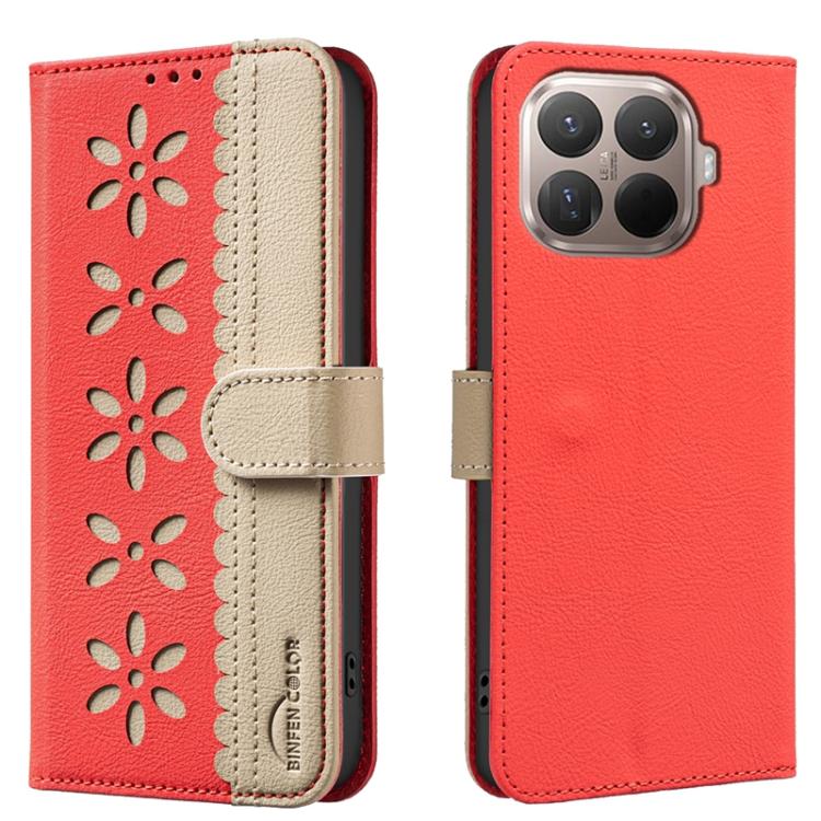 For Xiaomi 15T Pro 5G Splicing Color Hollow Flower Pattern RFID Leather Phone Case(Red)