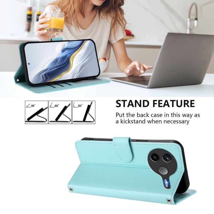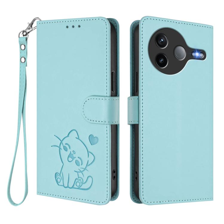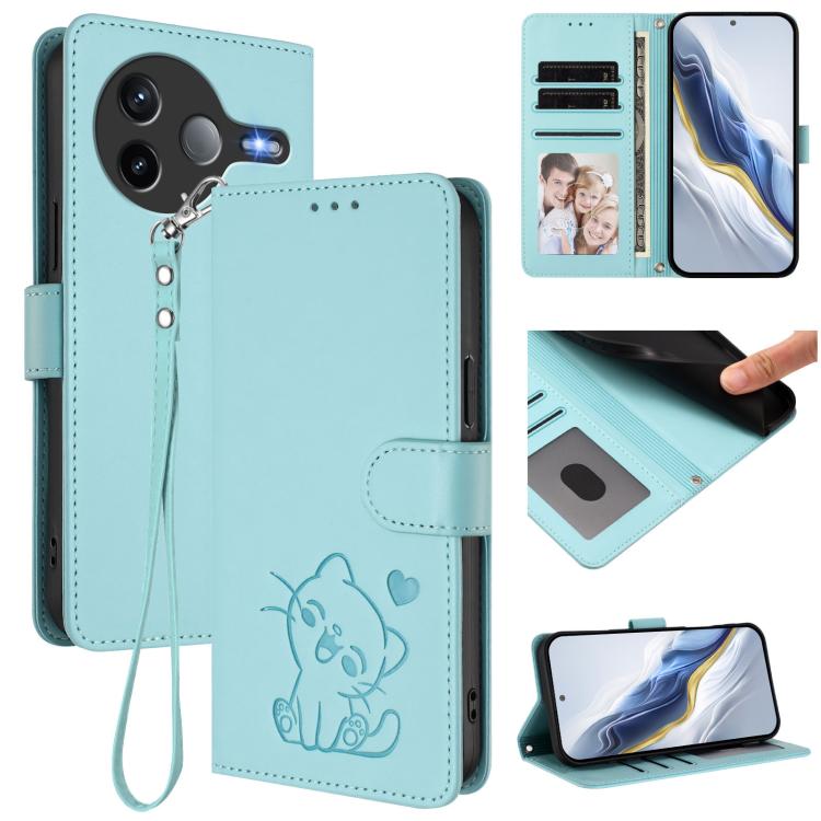 For Xiaomi Poco F7 Pro 5G / Redmi K80 Embossed Heart Cat Leather Phone Case with Hand Strap(Mint Green)