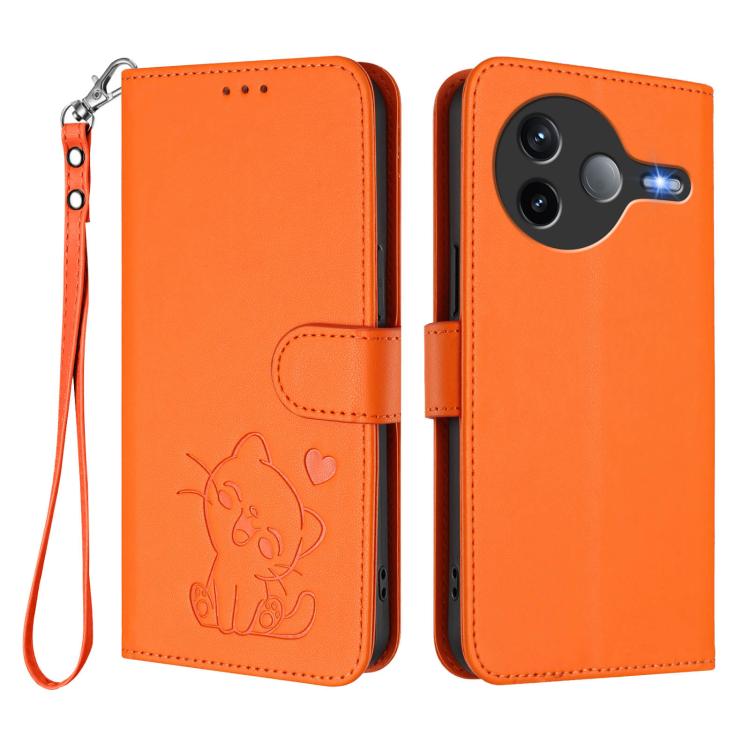 For Xiaomi Poco F7 Pro 5G / Redmi K80 Embossed Heart Cat Leather Phone Case with Hand Strap(Orange)