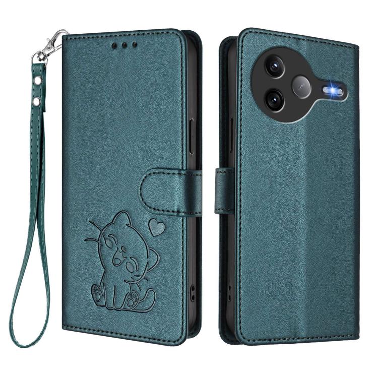 For Xiaomi Poco F7 Ultra 5G / Redmi K80 Pro Embossed Heart Cat Leather Phone Case with Hand Strap(Dark Green)
