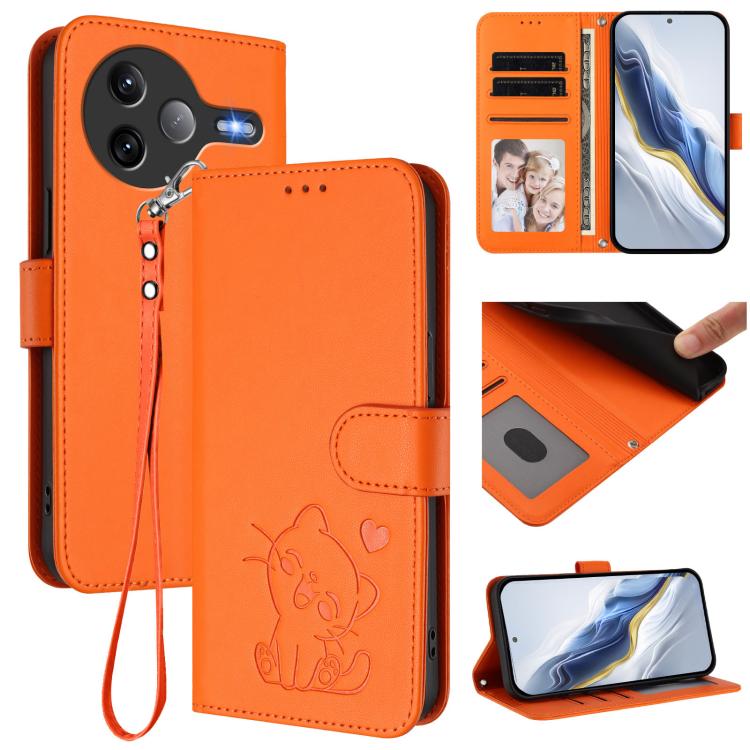 For Xiaomi Poco F7 Ultra 5G / Redmi K80 Pro Embossed Heart Cat Leather Phone Case with Hand Strap(Orange)