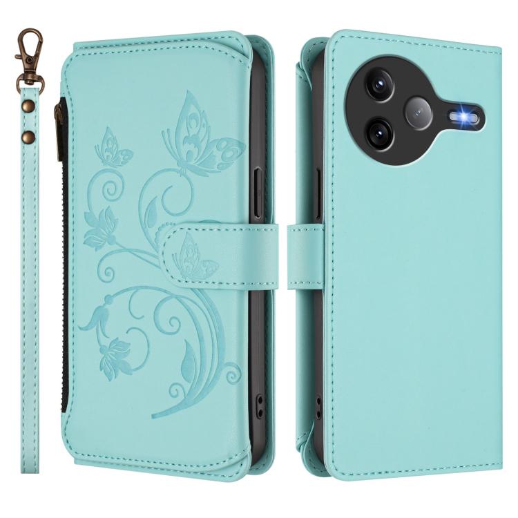 For Xiaomi Poco F7 Ultra / Redmi K80 Pro Butterfly Love Flower Multi-card Zipper Wallet Leather Phone Case(Mint Green)