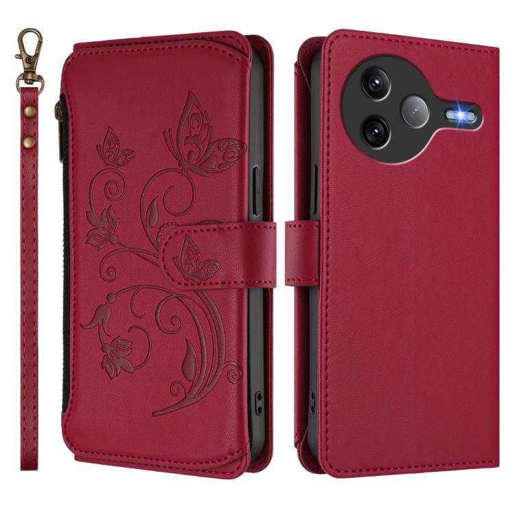 For Xiaomi Poco F7 Ultra / Redmi K80 Pro Butterfly Love Flower Multi-card Zipper Wallet Leather Phone Case(Wine Red)