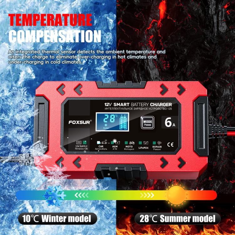 FOXSUR FBC1206F 12V 6A Car Motorcycle Battery Charger Smart Repair Multi-function Charger, EU Plug(Red)