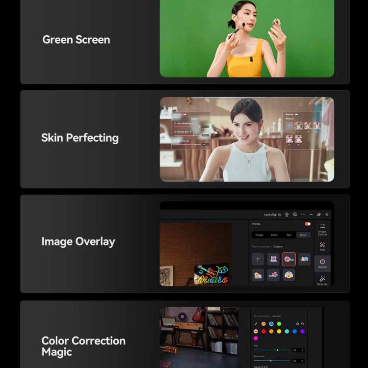 10. Software Control: Via the HollyStudio software, you can not only fine-tune focus, ISO, white balance, brightness, and contrast using sliders but also achieve skin smoothing and dynamic background removal with one click. Furthermore, you can directly adjust microphone settings within the same interface.